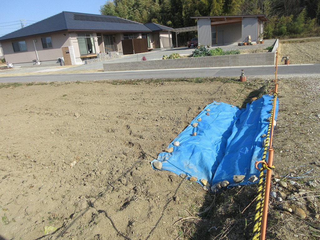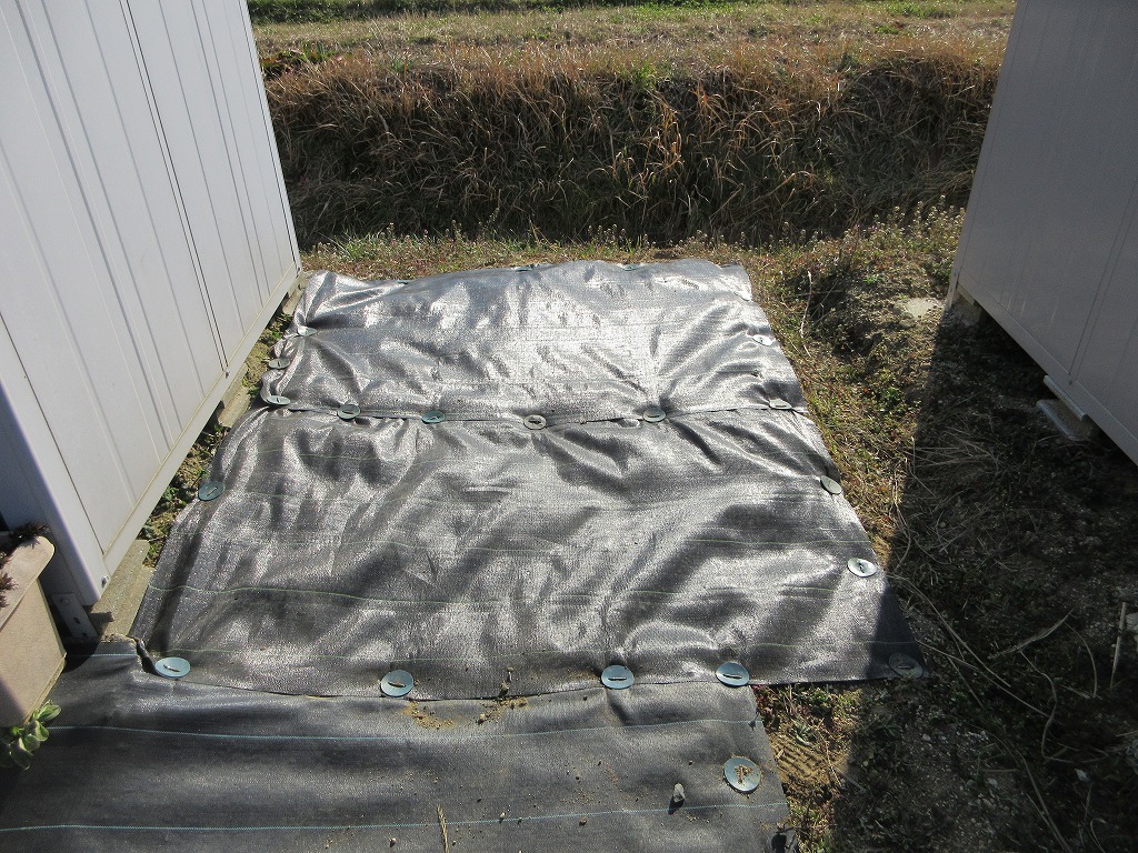 晴天の下、馬糞の受け入れ準備でブルーシートを敷き、物置の間には防草シートを張りました。