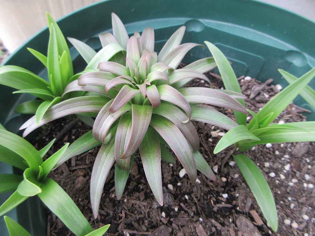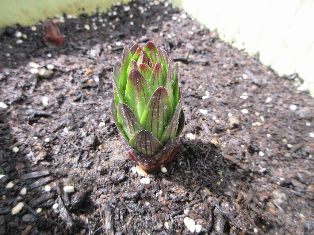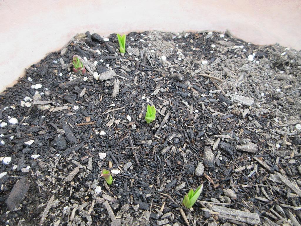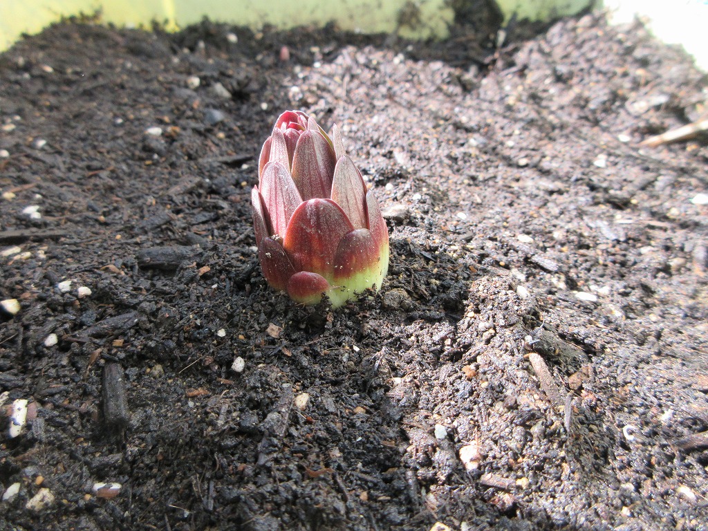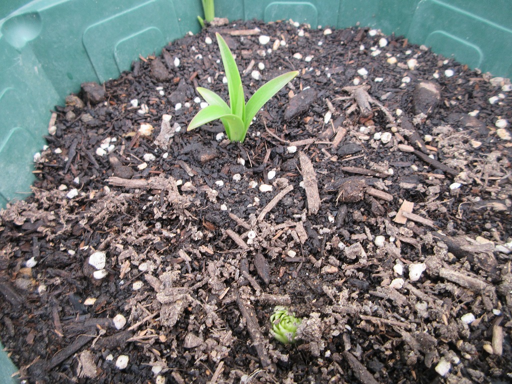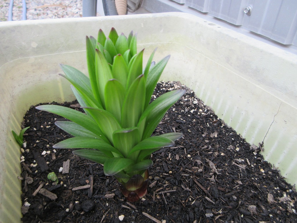 ユリも昨日水をやったせいか、少し伸びて根元に緑色が見えてきました。