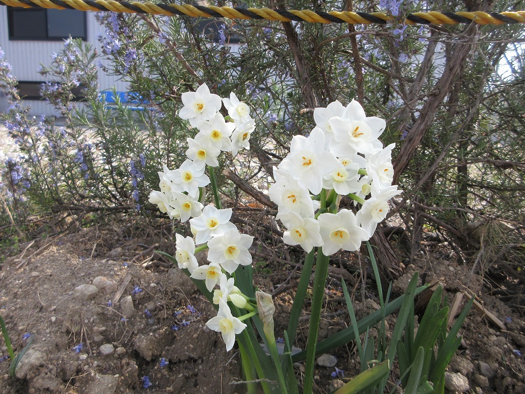さくらんぼの花が散り始め、スイセンは花が大きくなってきました。ユリの蕾もほころびが進んでいます。