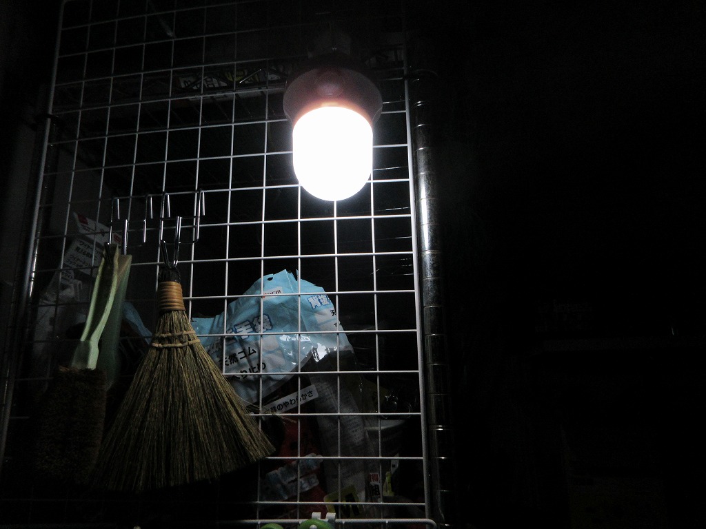 そして・・・過日ホームセンターで買った人感センサーライトを物置に吊るしました(^^)