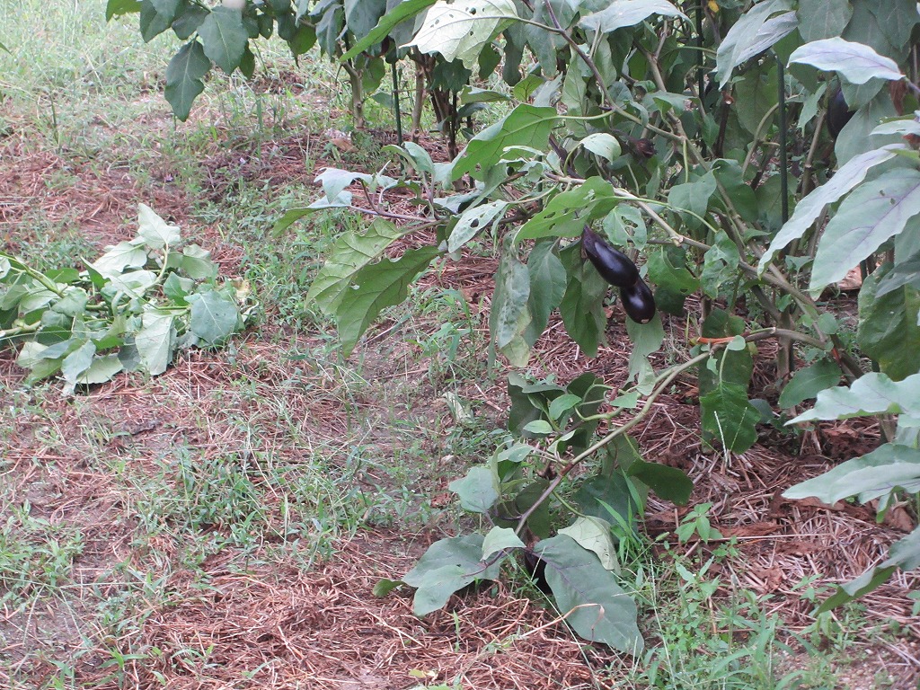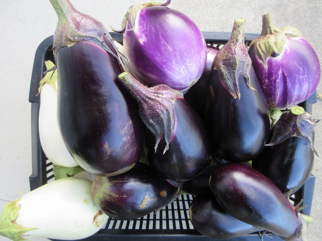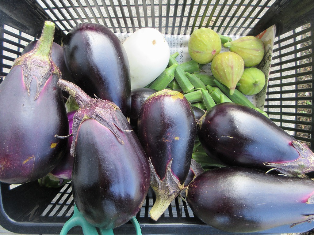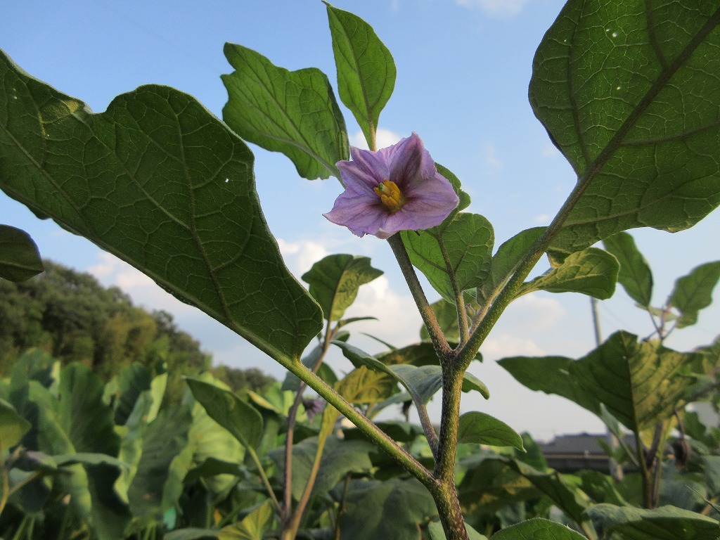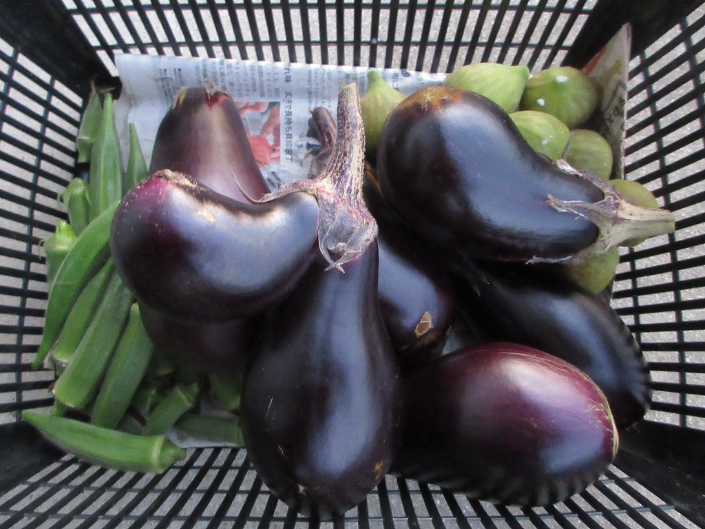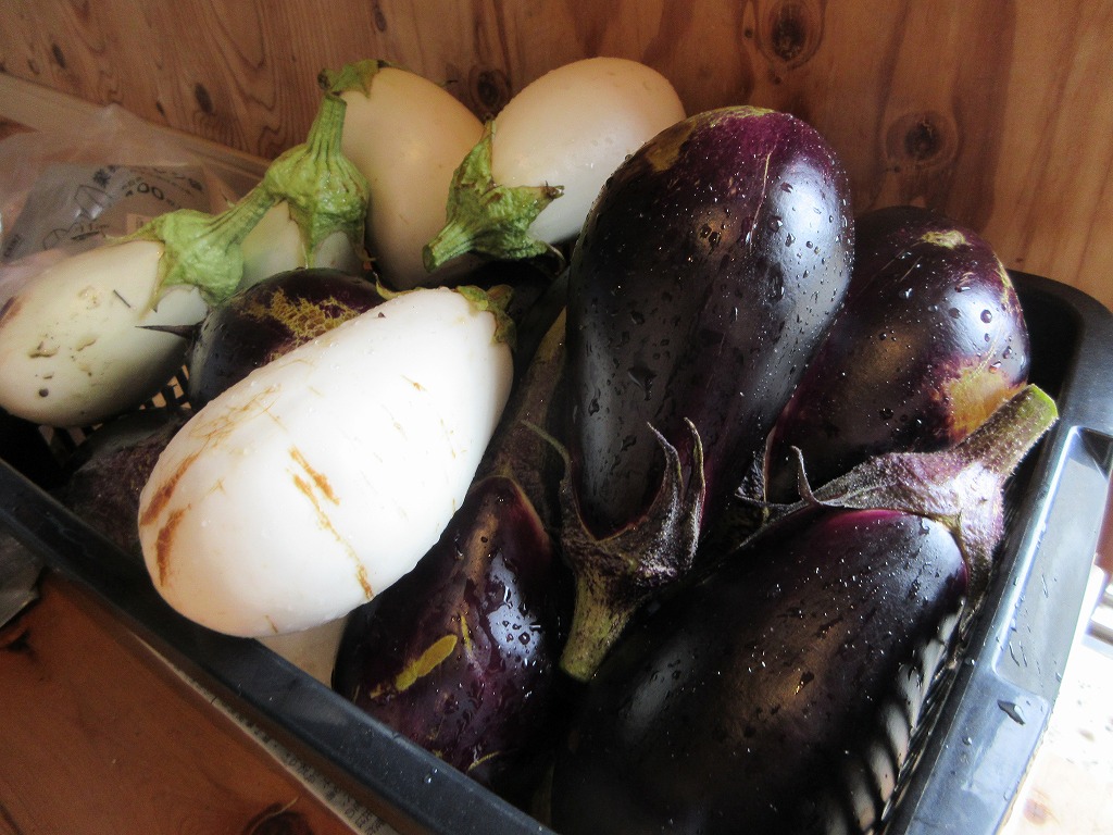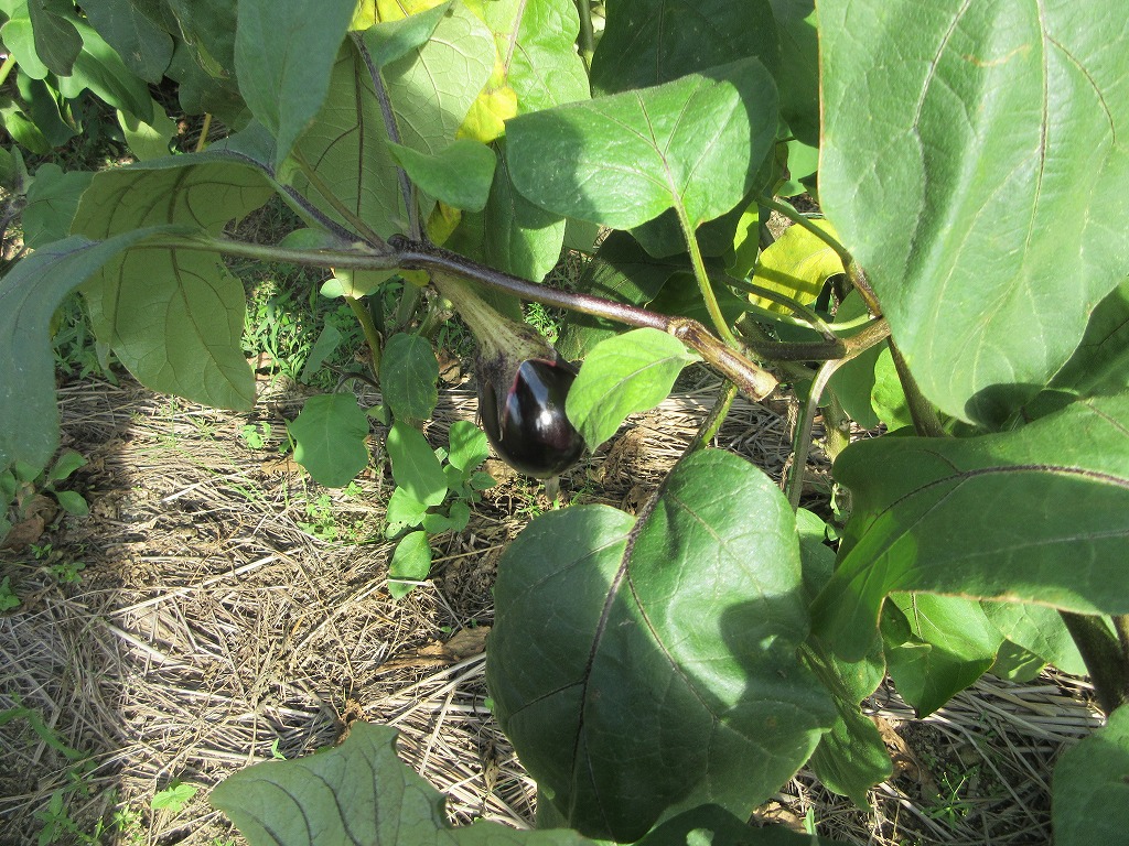 そんな陽射しを浴びてナスが宝石のように眩しく輝いてます。先週末の雨が尾を引いて?