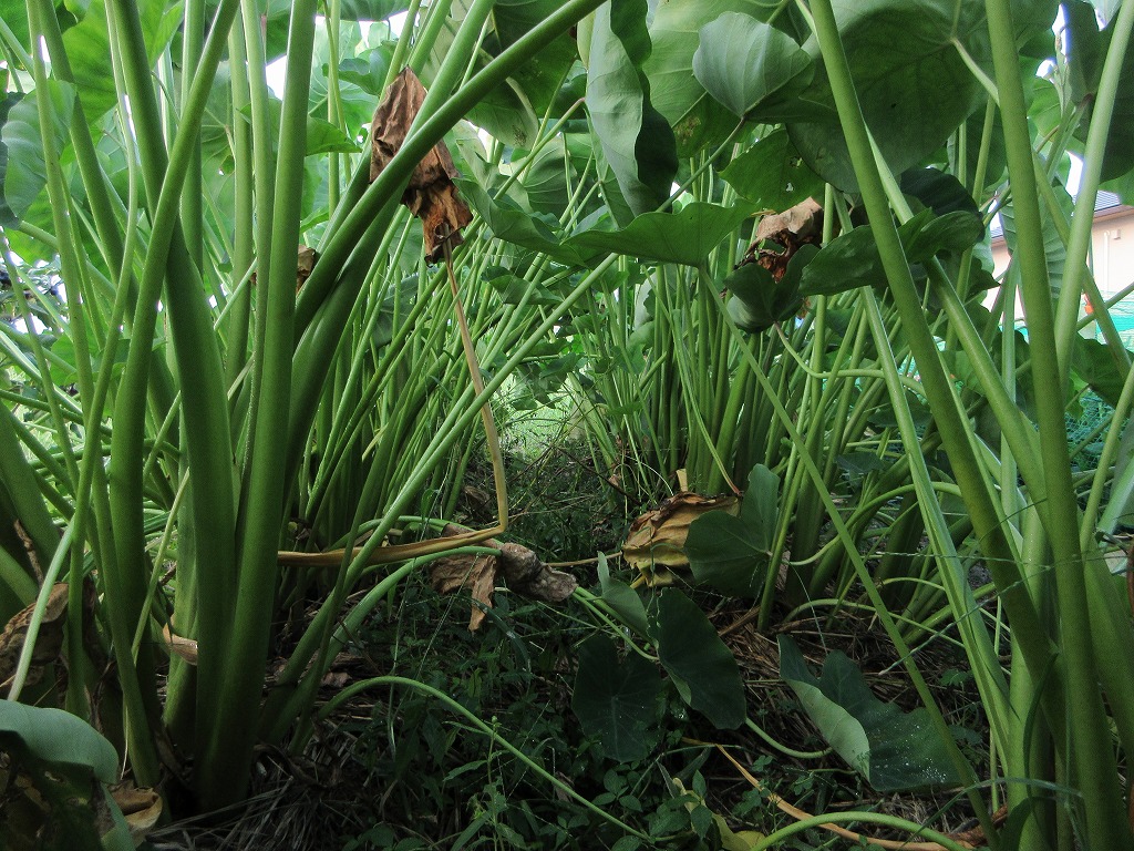 収穫は、オクラも多いですが今はナスが連日豊作。ふと思いつき、サトイモの林に潜り込んでパチリ!