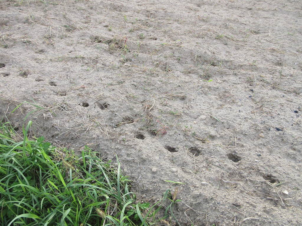 側溝周りの草刈りをしました。反対側はもう少しやる予定。道場裏には怪しい足跡。猫や犬より大きな動物っぽい{{{{(+_+)}}}}