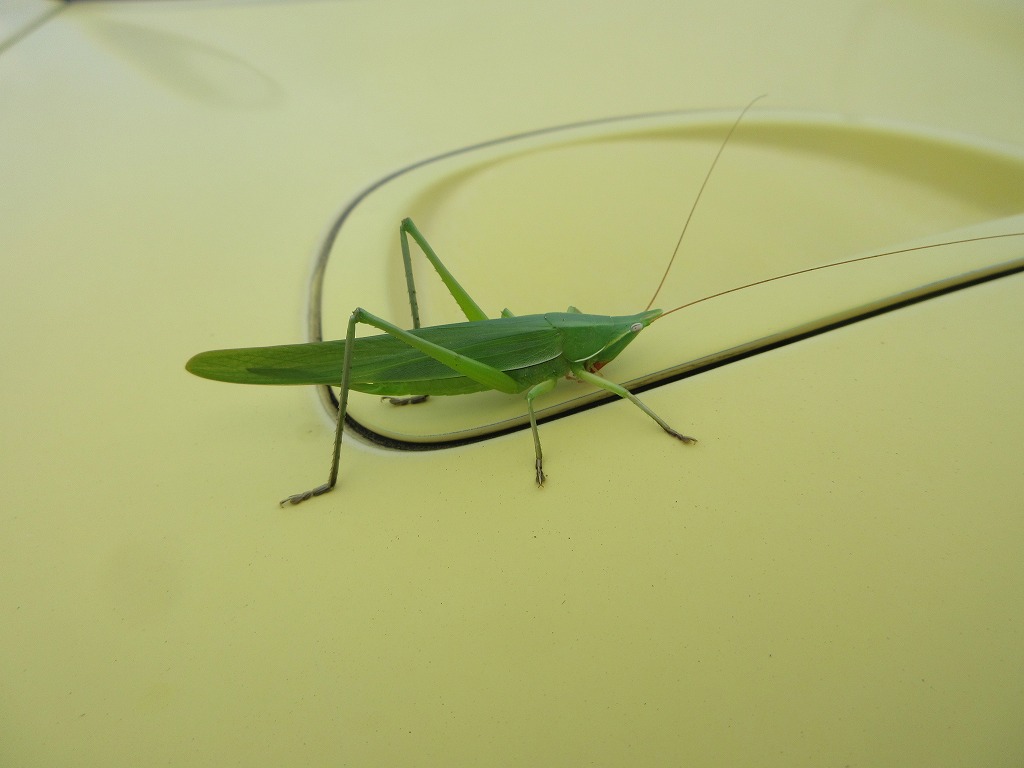 田んぼにはナガバオモダカの花も。帰り際、愛車Cちゃんのフードの上にはツユムシ。