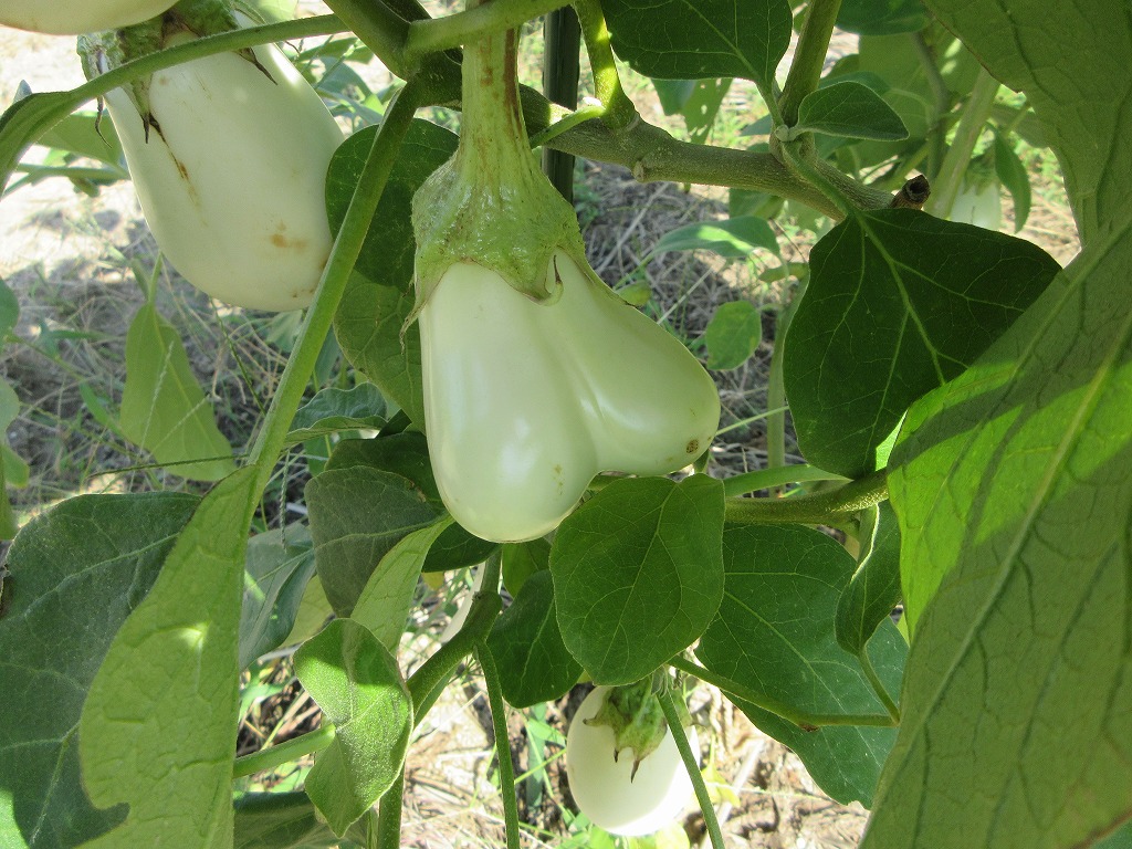アスパラが元気いっぱい伸びています。白ナスが珍しい形になっています。