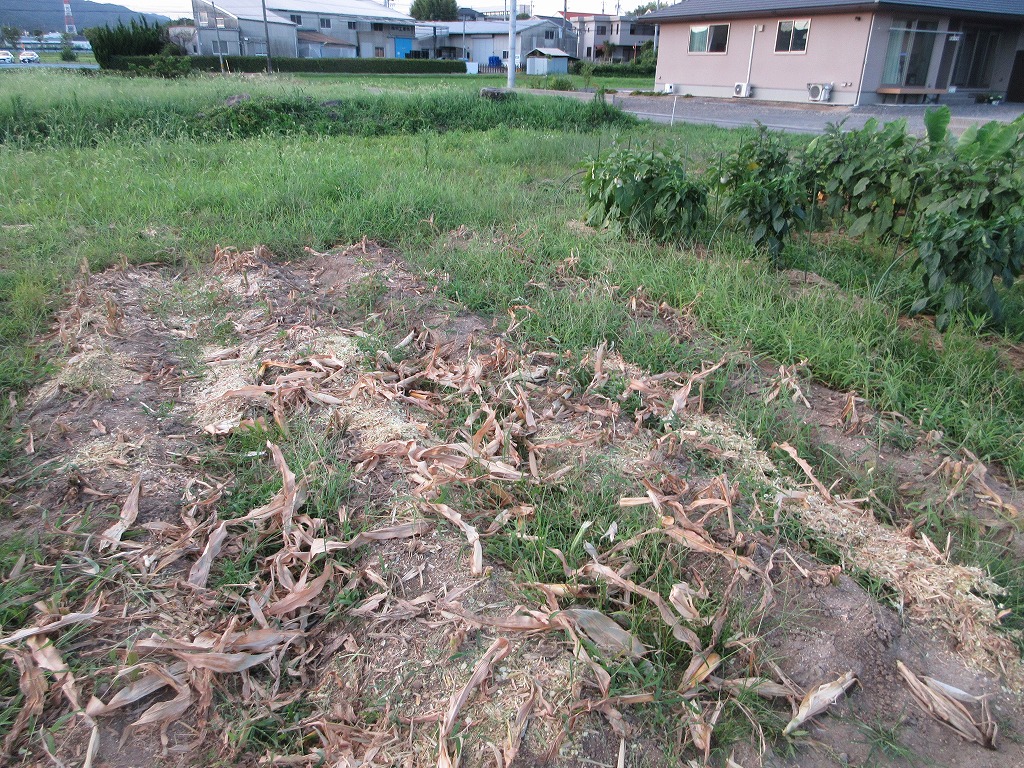 昨日からの雨で水やりは不要だったので、その隙にトウモロコシの黒マルチ剥がし、用水路の土手、道沿いの草を刈りました。