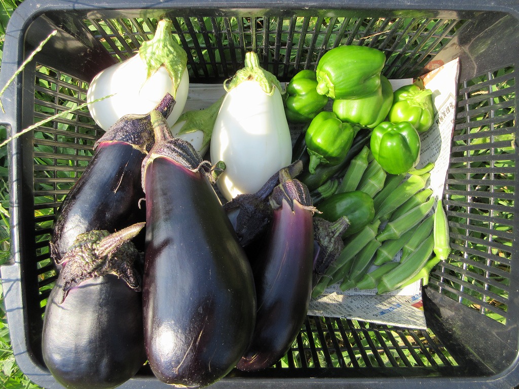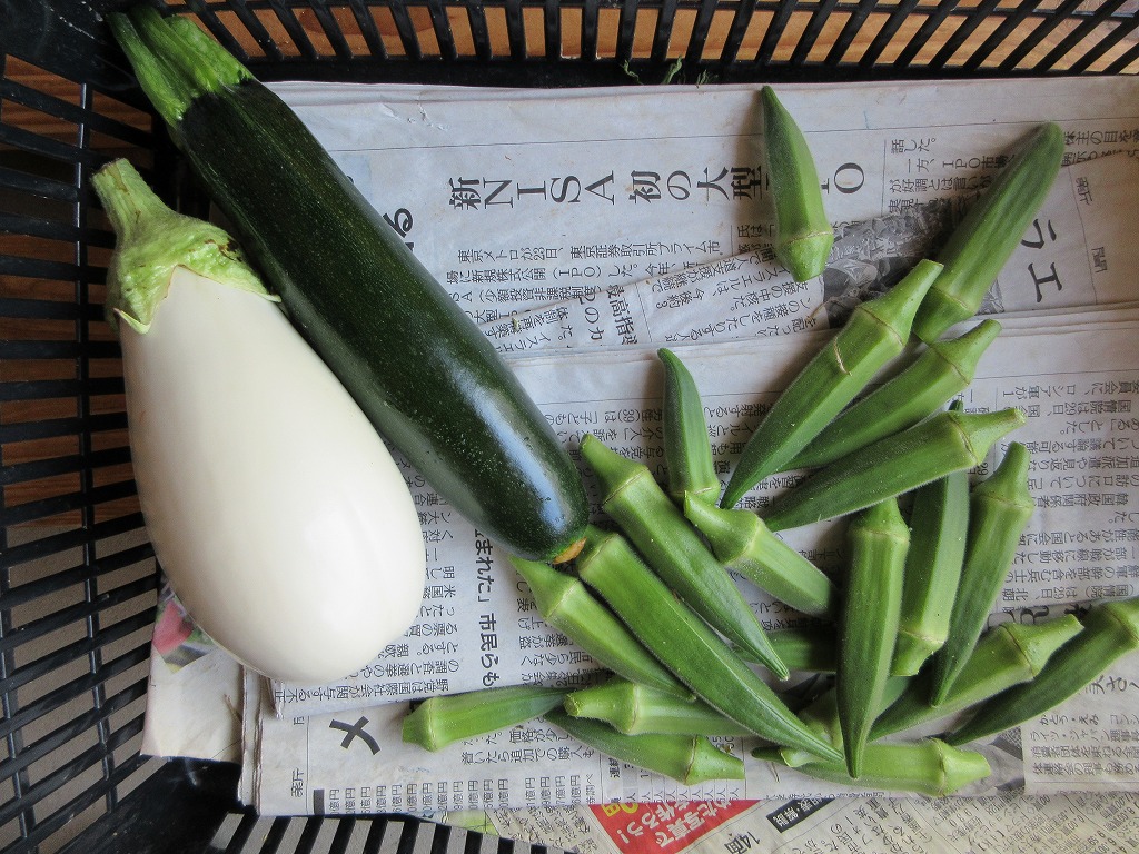 収穫はナス、白ナス、ピーマン、オクラ、ズッキーニ。一仕事終わった頃にまた雨が降り出しました。間に合ってよかった(^^)