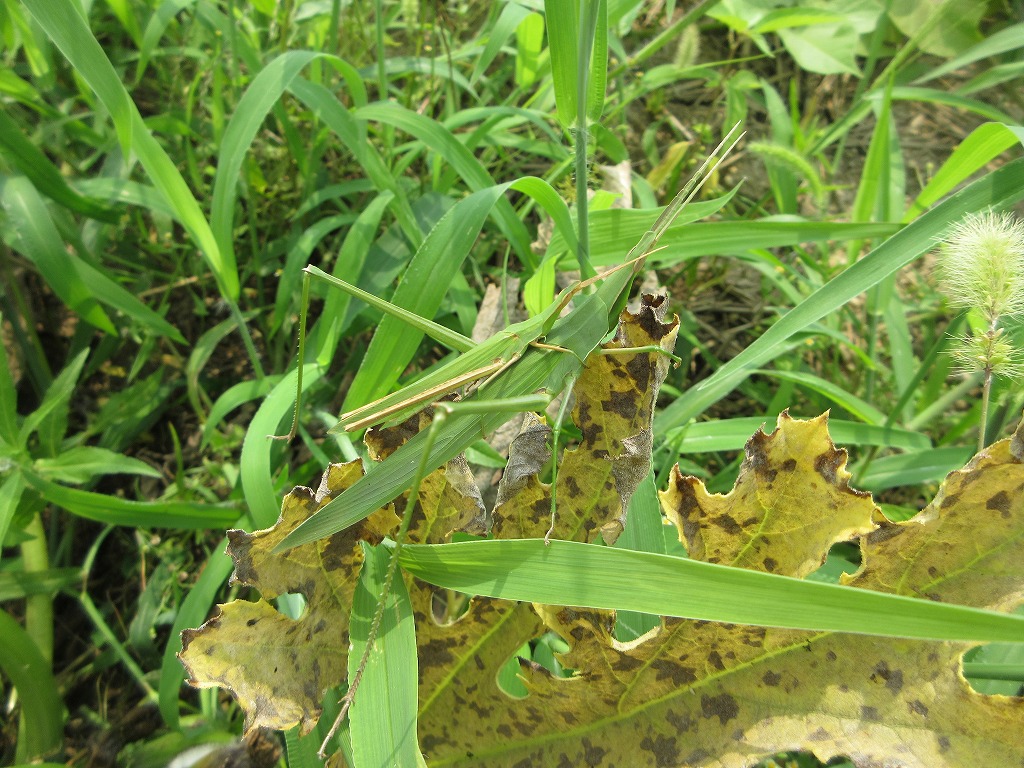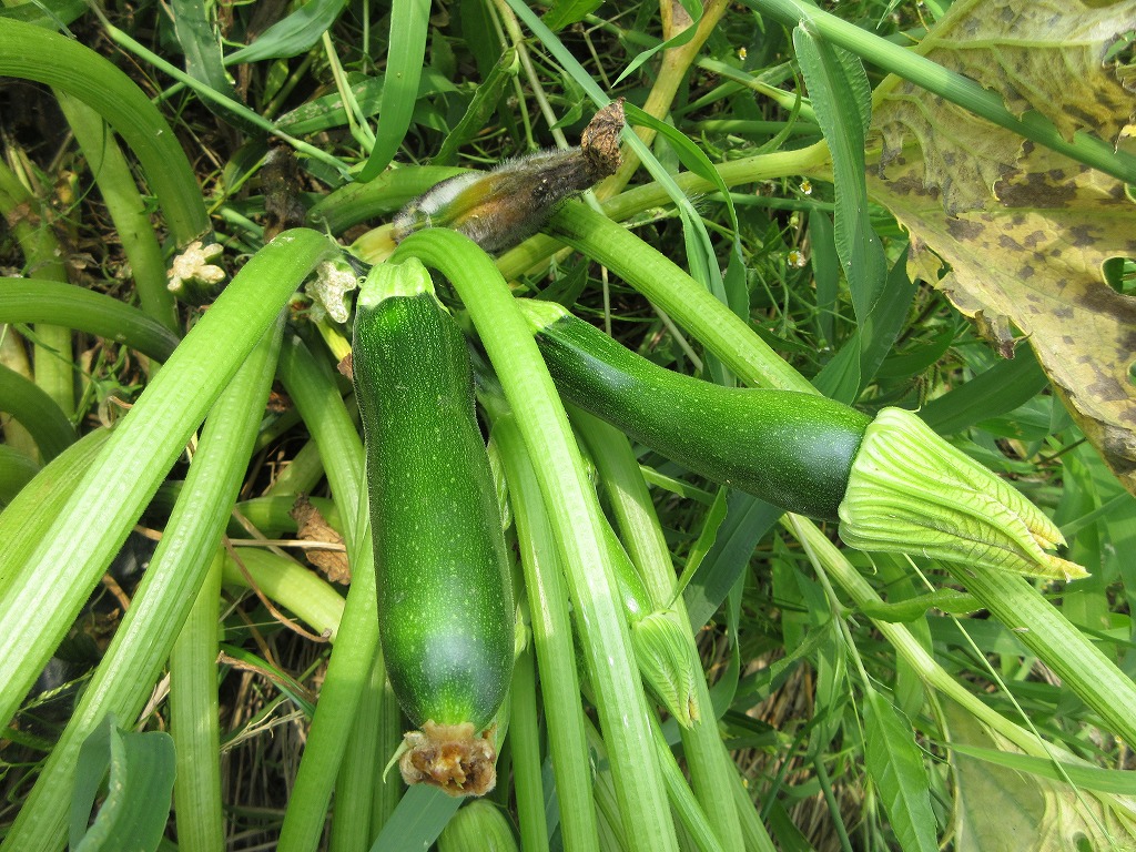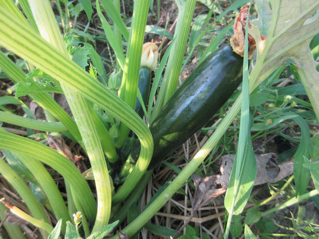 ズッキーニがまた何本か生りはじめています。葉陰にオンブバッタがいました。