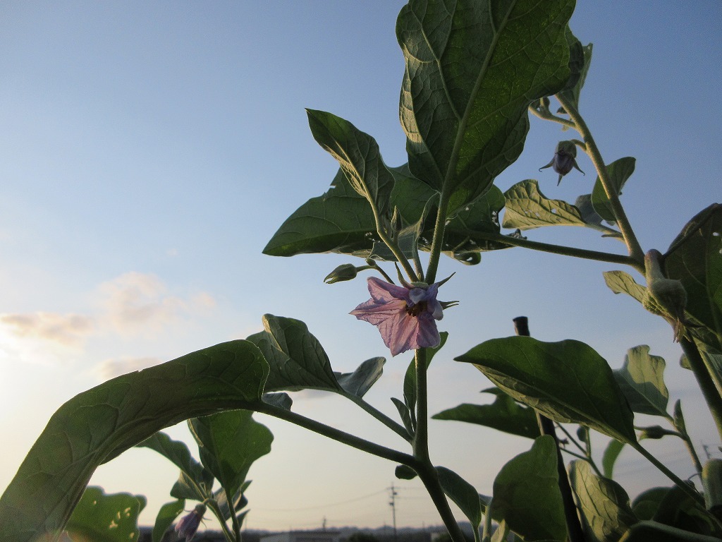 収穫は少なめ。ピーマン、ナスの花が夕陽に映えました。