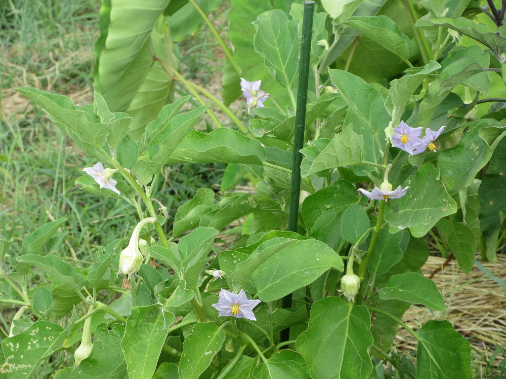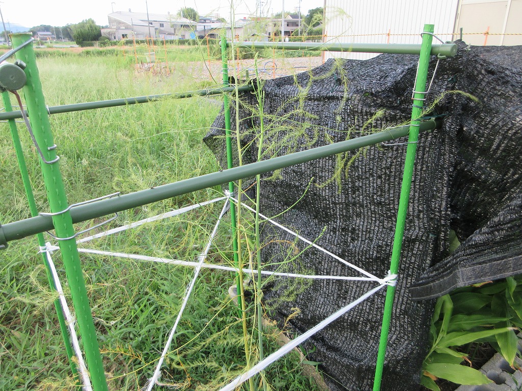 ナスの花がしっかり咲いてます。アスパラガスは支え用の紐の高さを超えました。