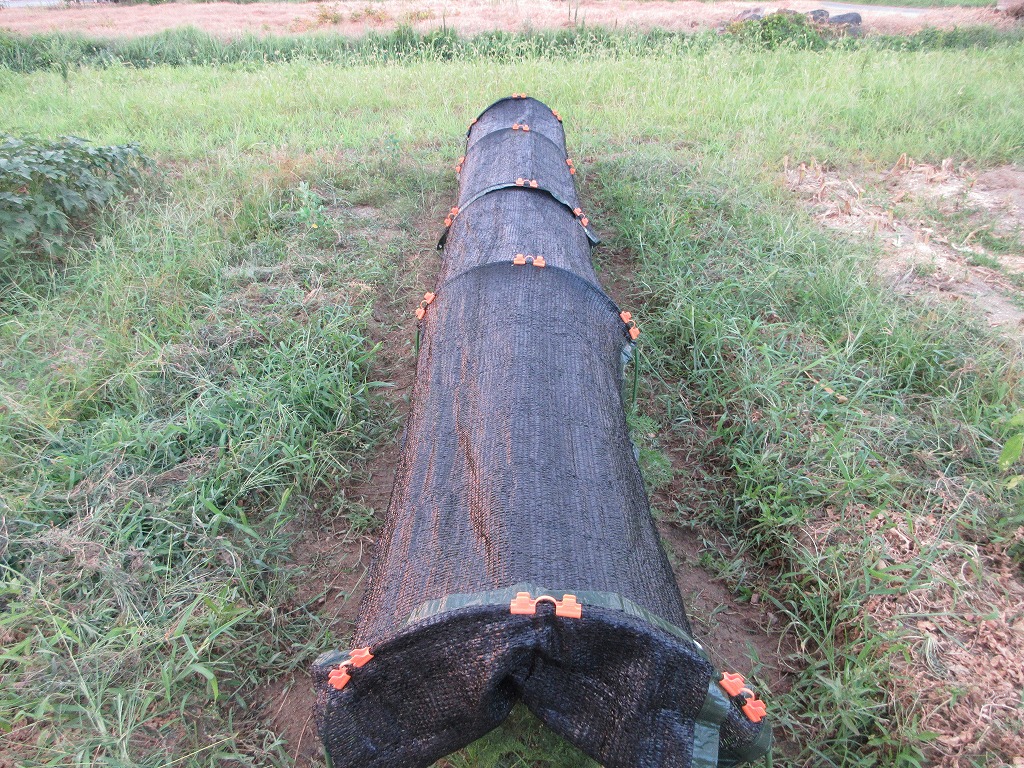 ニンジンの日焼け防止に遮光ネットを掛け、オクラの下葉切りをしました。