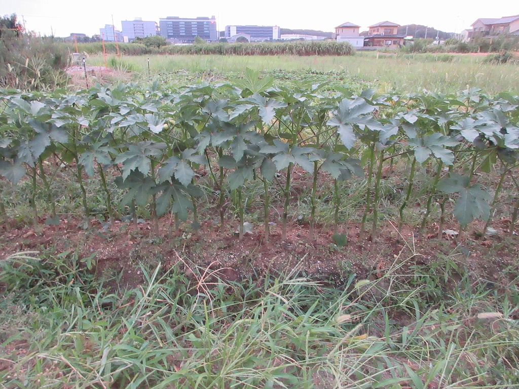 昼一に畑へ…時間が早かったのでオクラの花が観られました。