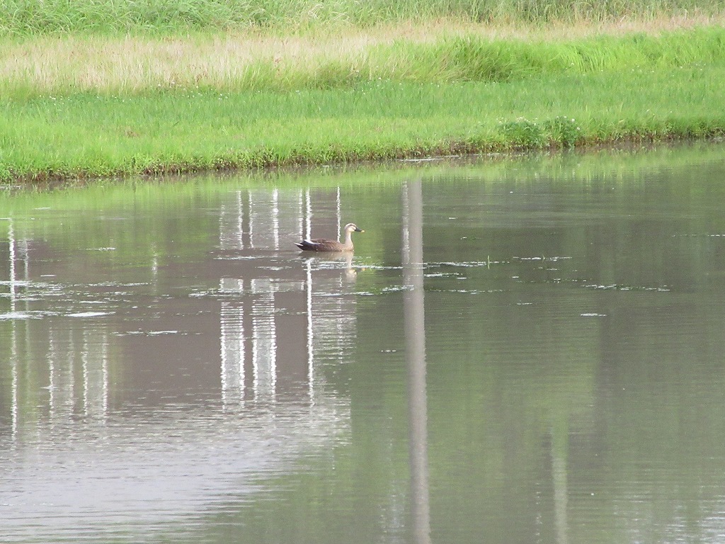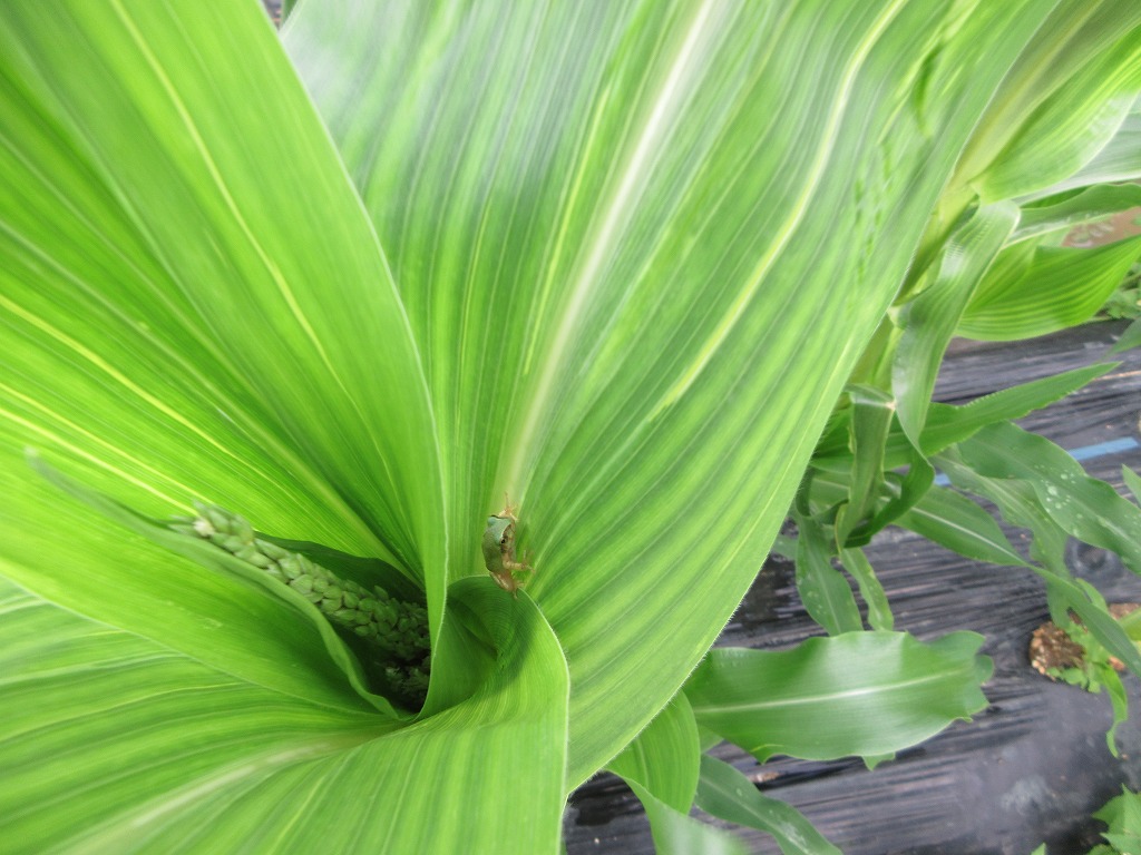 カルガモが一羽、前の田んぼに・・・トウモロコシの雄花が次々出てきています。なぜか多くの中にカエルが潜んでる。