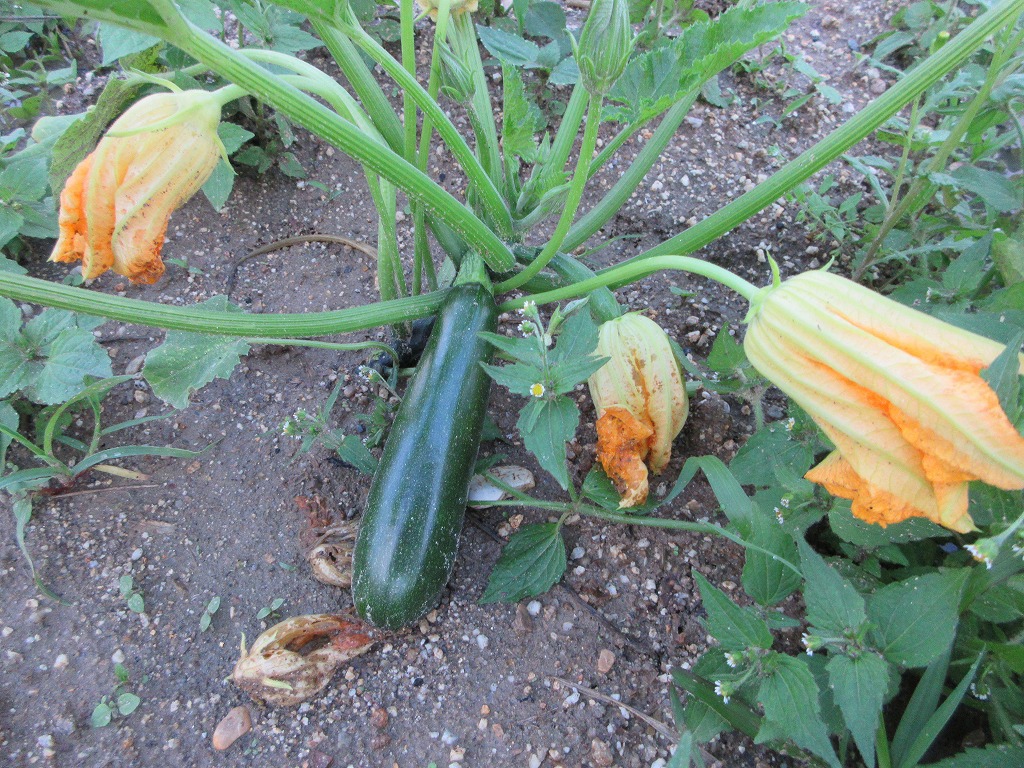 サツマイモはじめ畝の作りが下手で水はけが悪い(=_=;)ユリの熟しが進んでいます。ズッキーニが一本生りました。