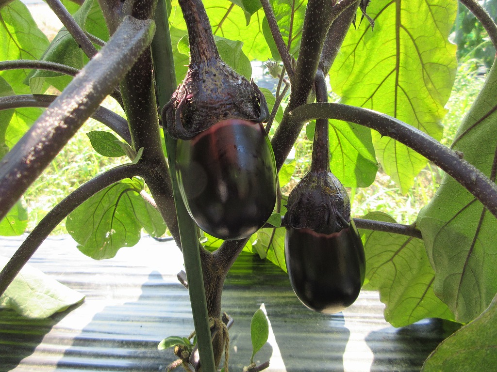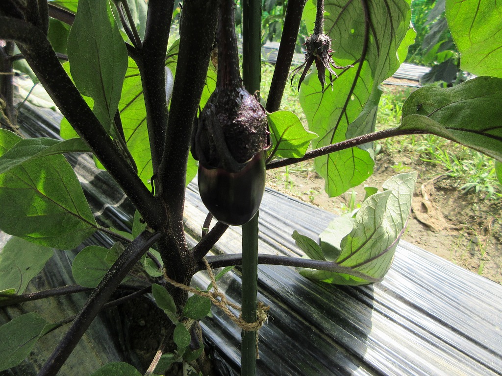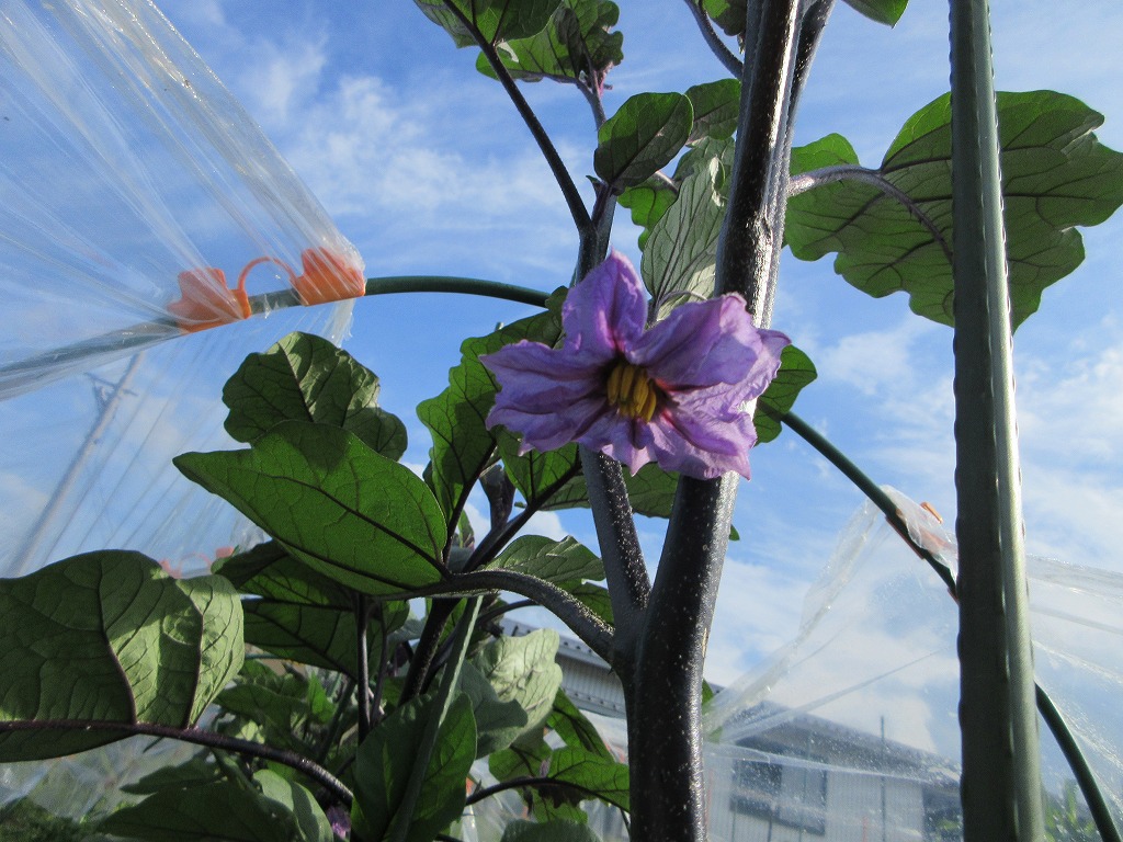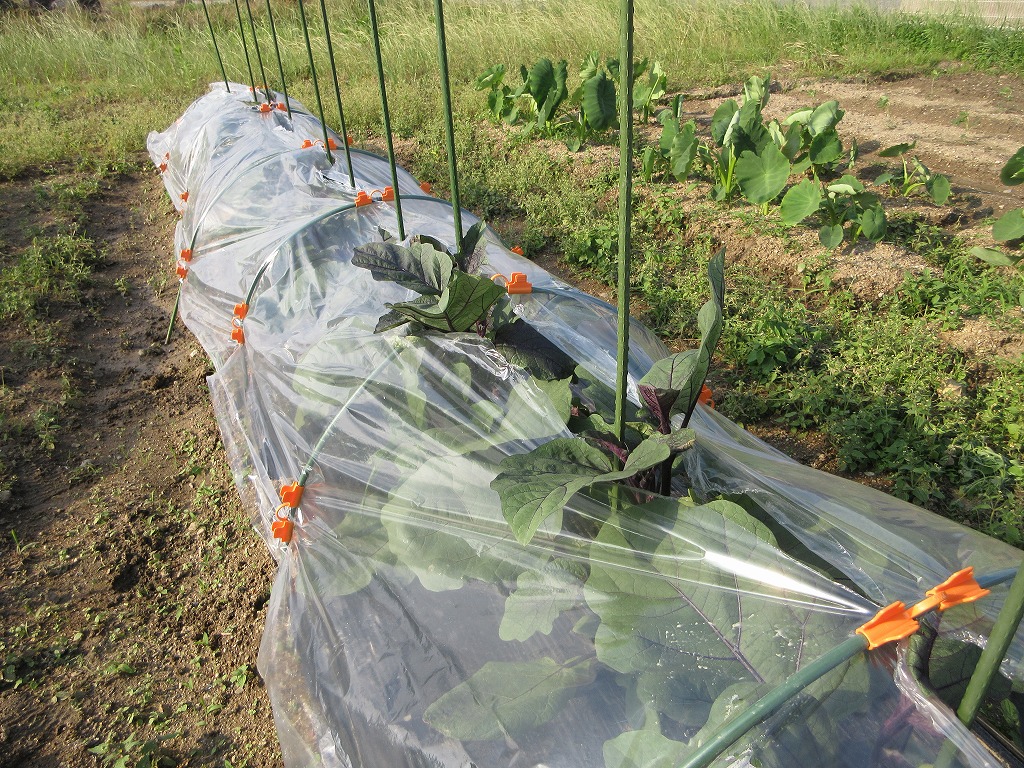 ナスが風よけビニールを越え始めました。そろそろ外し時かな。
