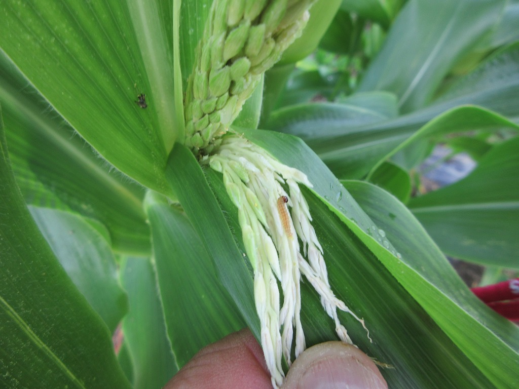 少し風が吹き、時折雲が太陽を遮ってくれる中、トウモロコシの雌花の消毒(昨日やらなかったので)