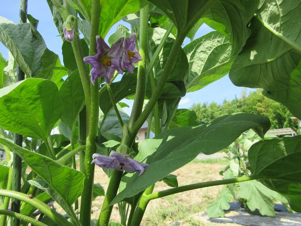 ナスとピーマンの風よけを解放しました。ユリが佳境です。トウモロコシの雌花がでました。ナスにも花が咲きました。
