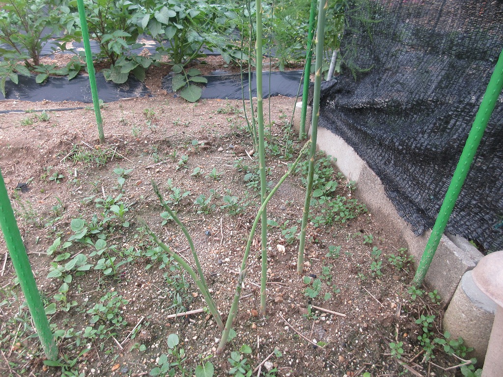 ジャガイモの花がどんどん咲いてきています。アスパラは枠外にはみ出し…でも元気に伸びてます(^^;)