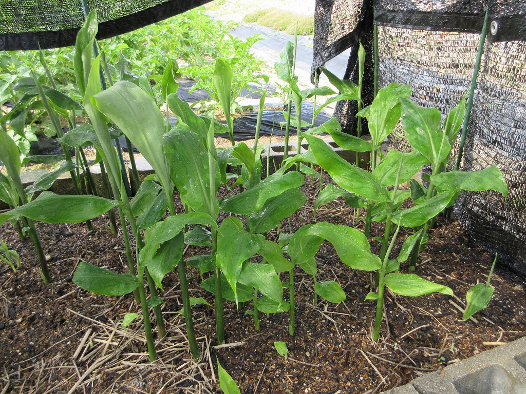 写真は決死のショットです(>o<;)ミョウガ、ジャガイモは順調です。
