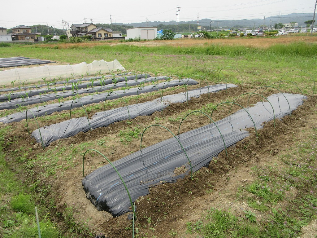 そして・・・オクラ、人参が芽吹きました。菜園長が土曜日にナス、ピーマンの畝にマルチ掛け。