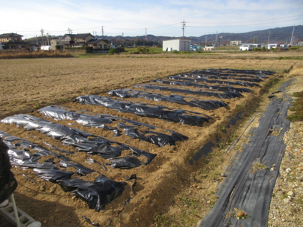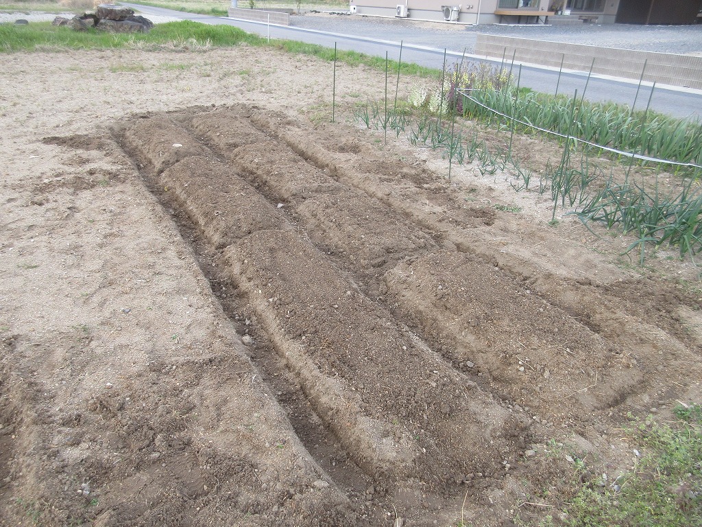 冬野菜の後地を整理し、残りの馬糞を撒いて耕しました。昨日からジャガイモの畝を作りはじめており、