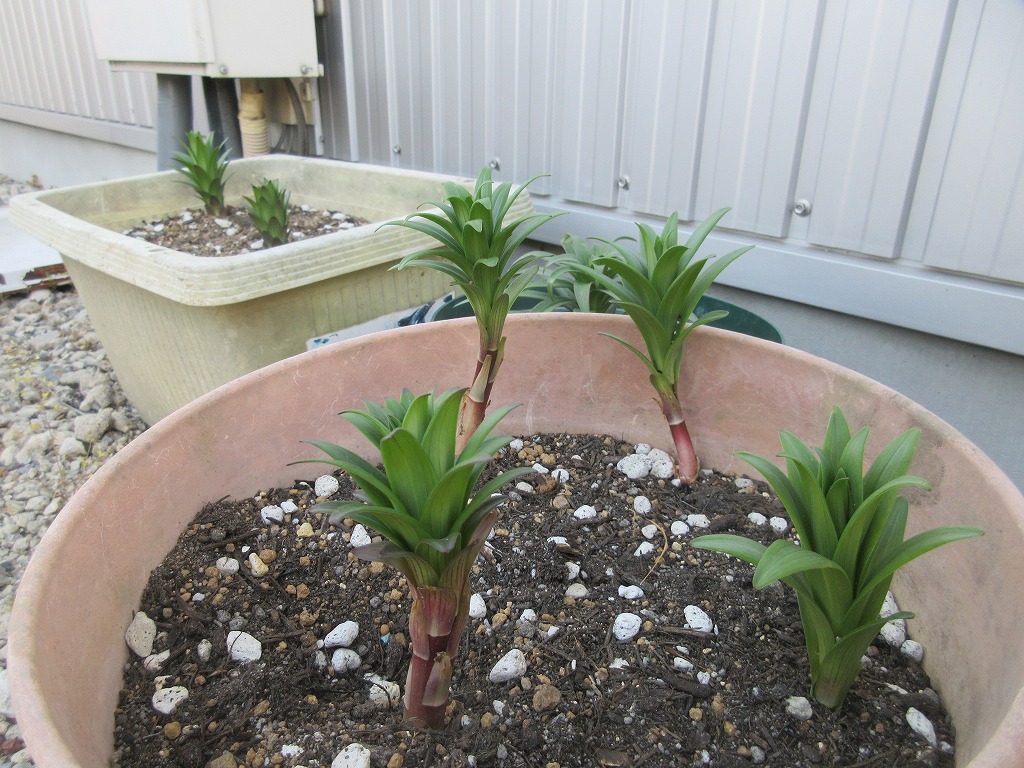葉ボタンはピークを過ぎたかなぁ。ユリがグッと伸び始めています。