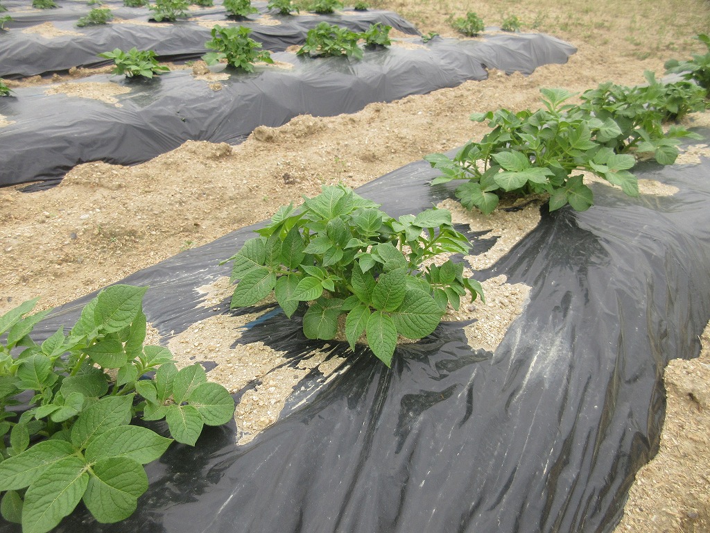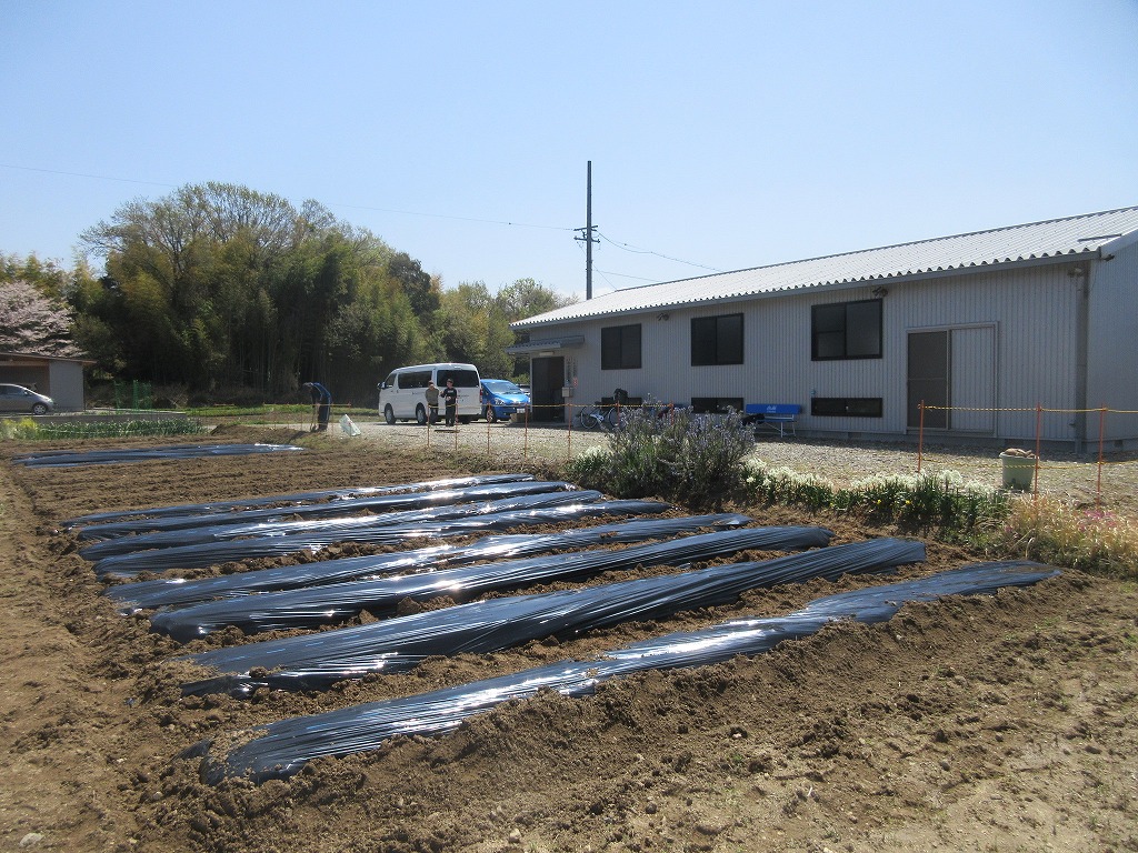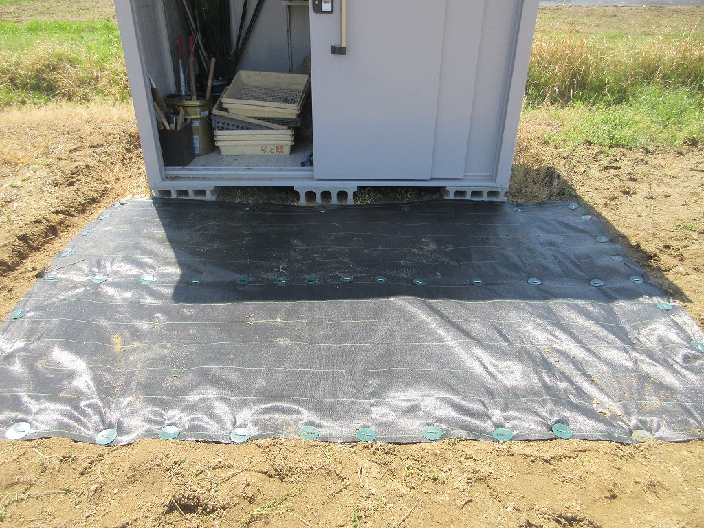 夏野菜の畝作りとマルチ掛け、物置前に防草シートを敷きました。