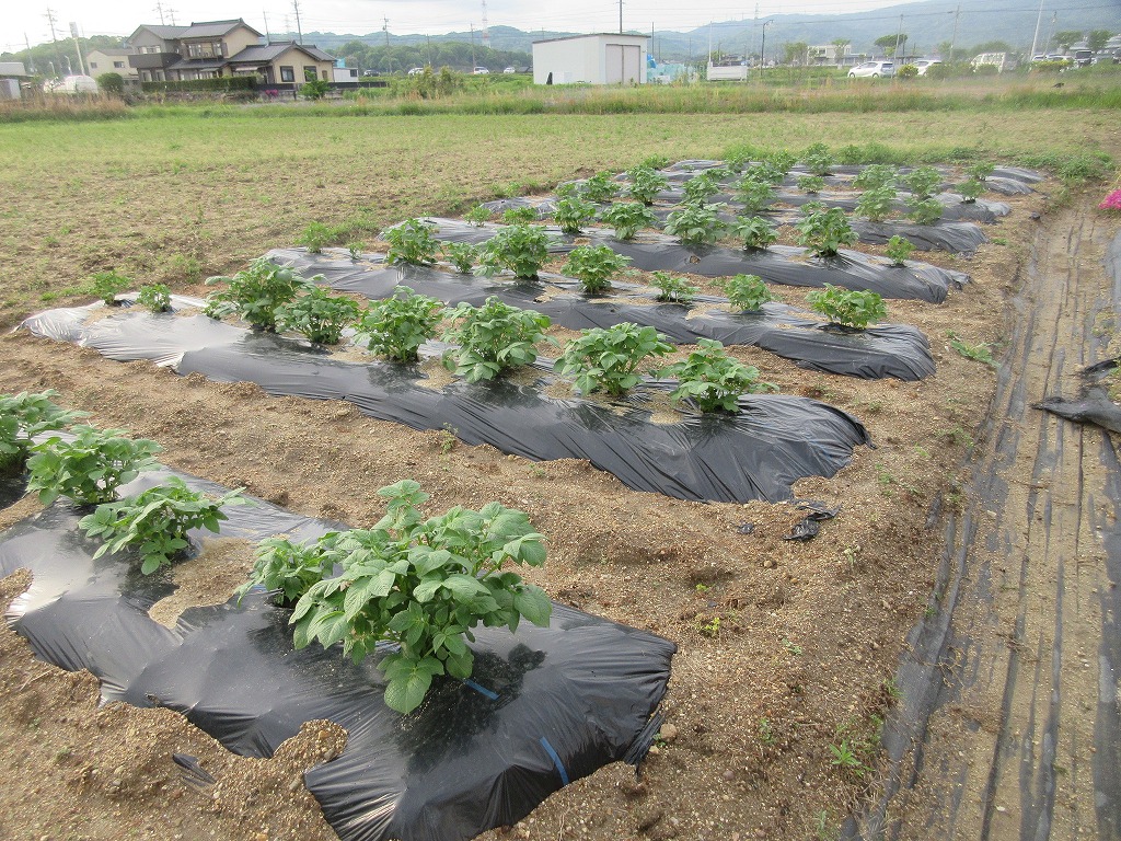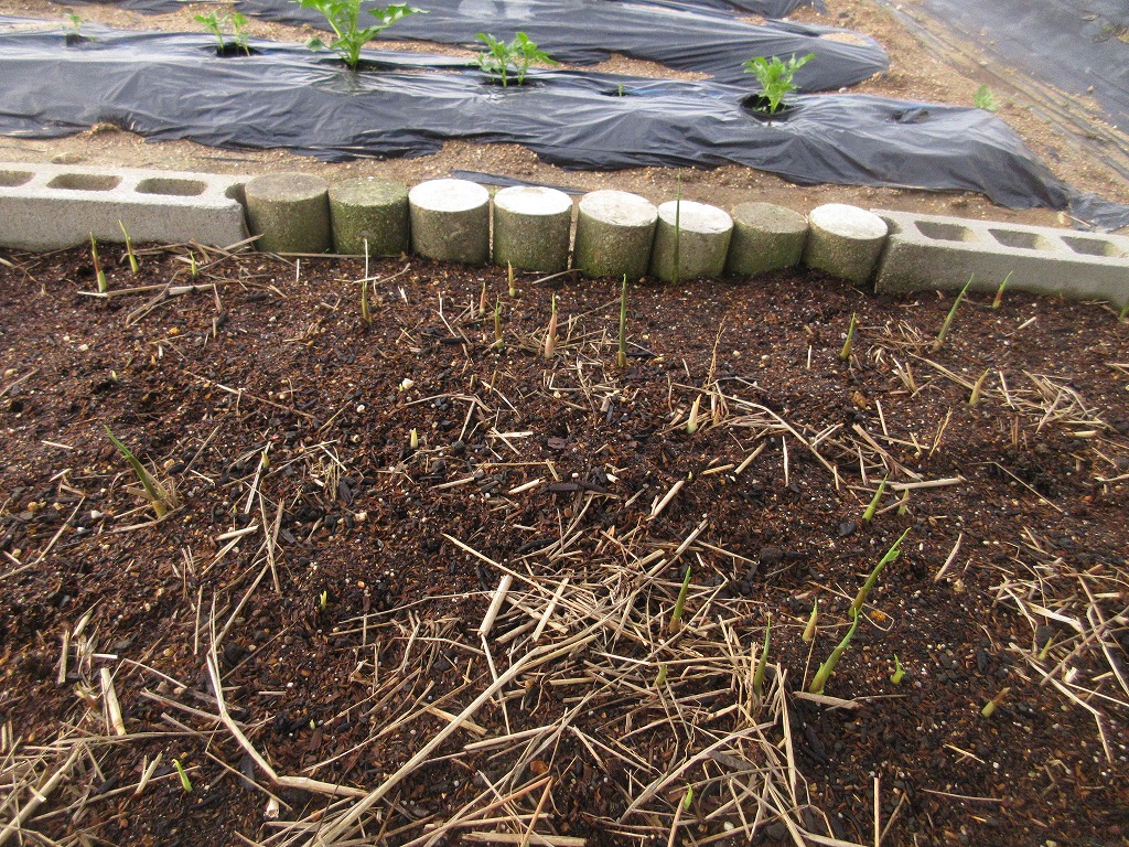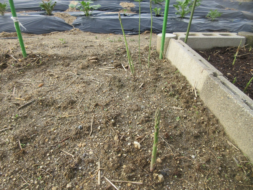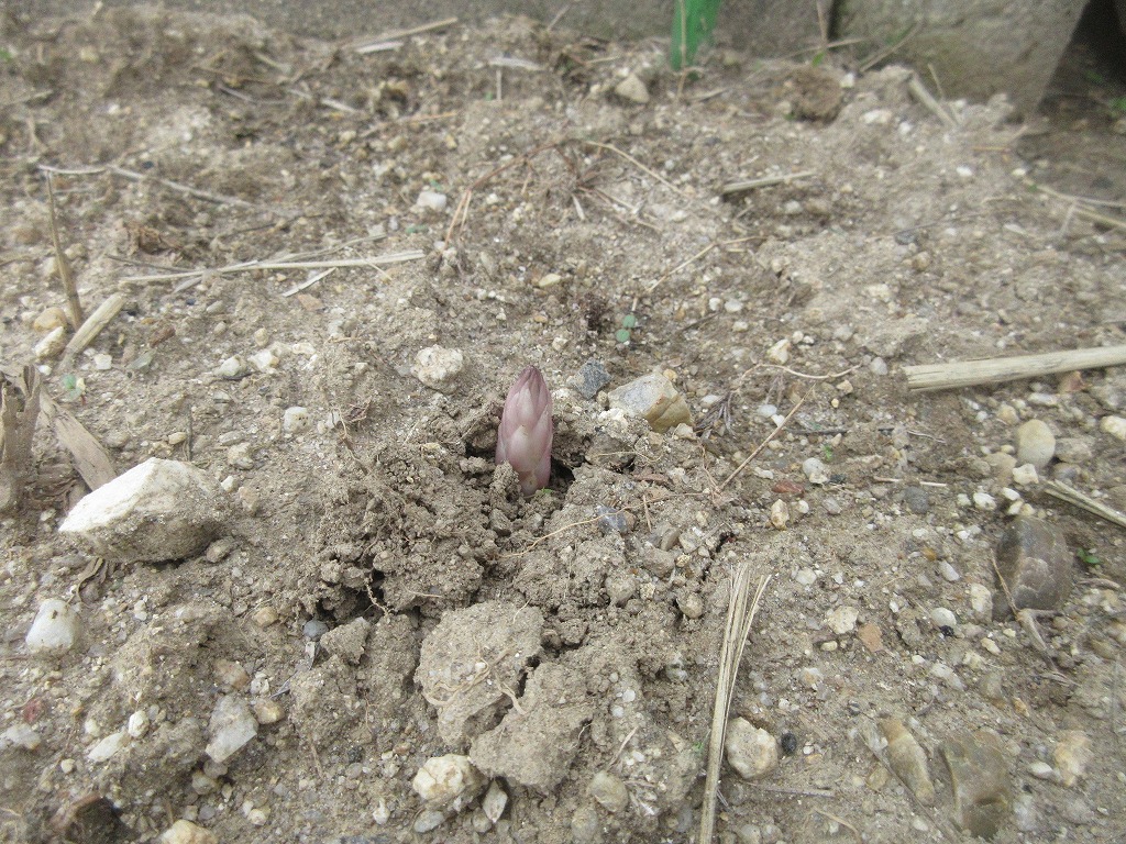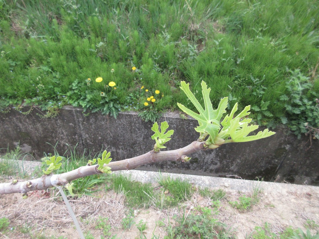 イチジク、ジャガイモの葉が大きくなってきました。ミョウガ、アスパラが芽吹きました。