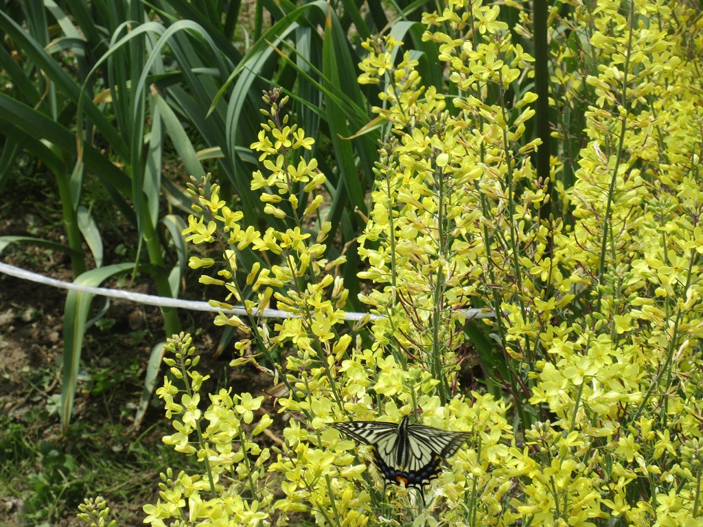 葉ボタンの花にアゲハチョウが飛んできました。電線にはヒヨドリ…いい季節です。