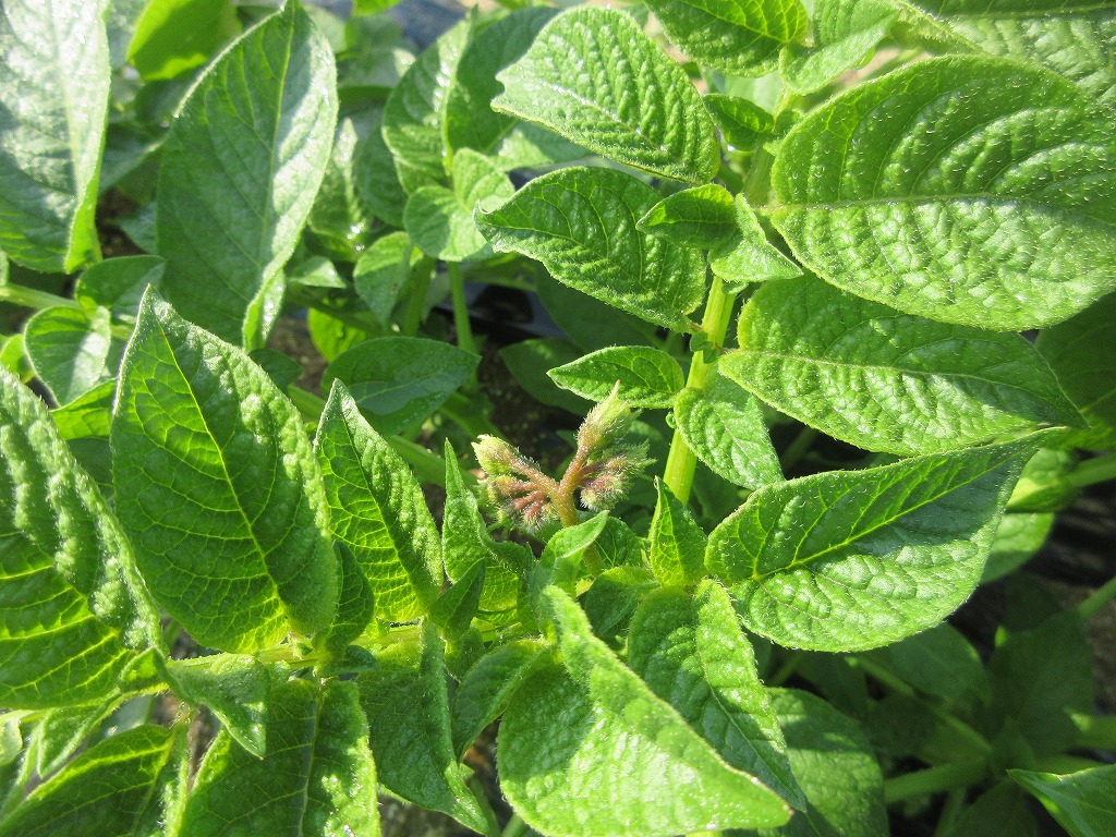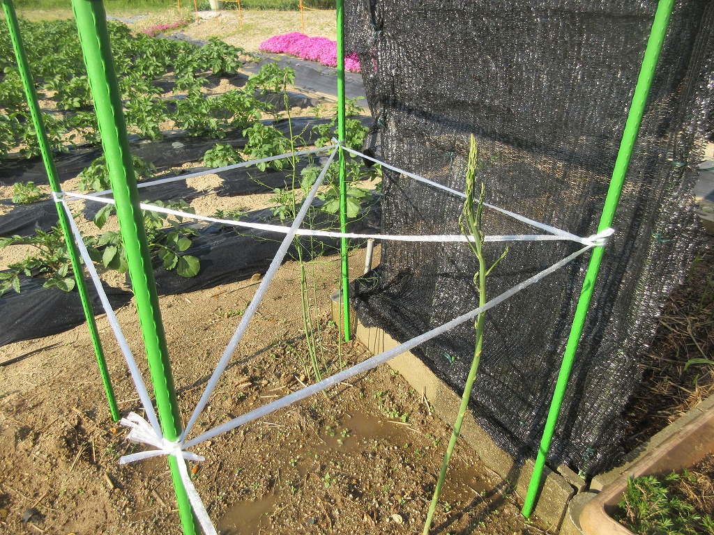 アスパラが伸びてきたので支えの紐かけ。そして、ジャガイモに蕾がつきました。